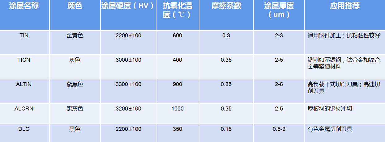 根据刀片的具体的加工形状、机床参数(工艺、速度等)、被加工材料(热处理工艺、硬度等),推荐使用不同的PVD刀片涂层。
